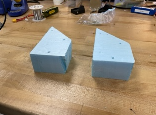 We switched to buoyancy foam, which we found didn’t absorb water by submerging a piece overnight and comparing the new weight against the dry weight. We used a hot wire cutter to slice through the foam to create our pieces since the original block of foam is too thick to cut with scissors. The pieces themselves were also cut slightly larger than the calculated amount so that in case the math was wrong, we could cut them smaller instead of having to cut entirely new floats.