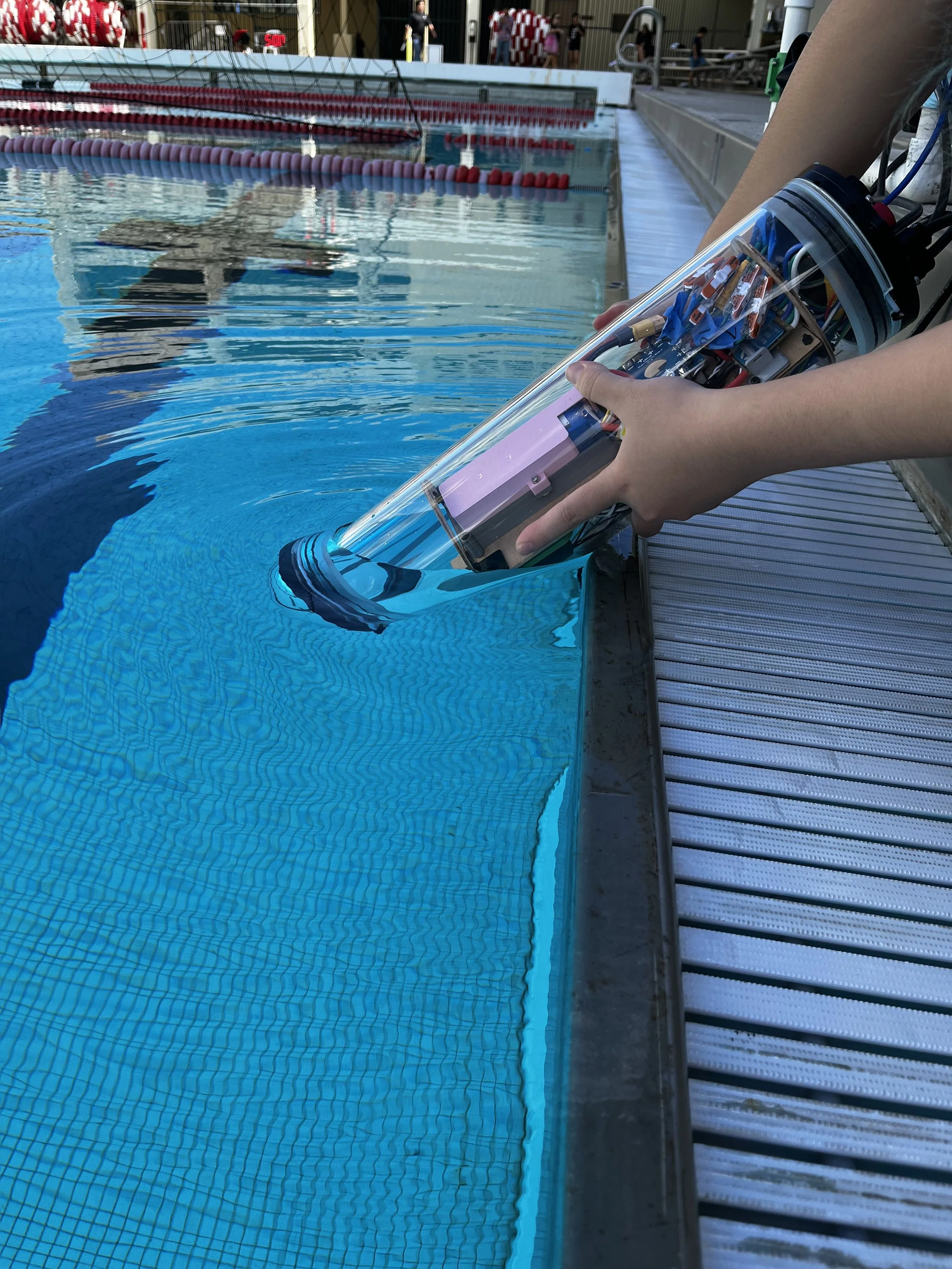 Finally the day of the pool test arrived. We succeeded in getting the PVC prototype done and tested in the pool before the end of our academic school year’s first quarter. After careful waterproofing and sealing the enclosure tube, we first tested just the enclosure tube in the water. We dipped the front end of the enclosure tube, the end without electronics, into the pool and observed that no water got into the enclosure tube.