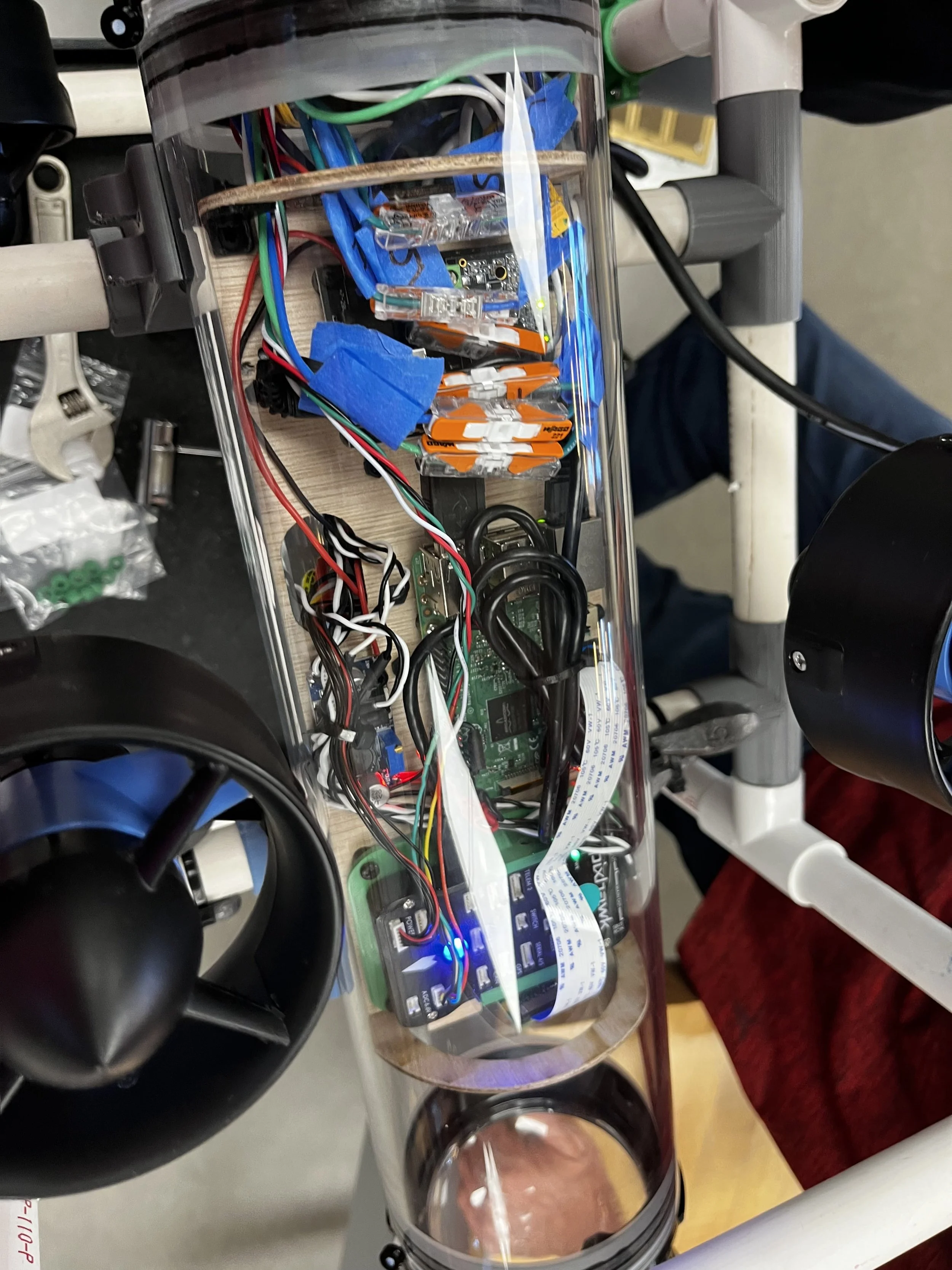 This gave us the green light to proceed with mounting the enclosure tube onto the PVC prototype and putting the whole system into the water. When it was in the water, the ROV sank slowly because it had a slight negative buoyancy. We were able to maintain a connection while the ROV was underwater and move it with all four thrusters controlled by the joystick. The vertical thrusters operated correctly and didn't tilt the ROV because they were centered. On the contrary, the horizontal thrusters tilt the ROV every time they are activated because they are positioned towards the back bottom of the ROV. We also maintained a live video feed.